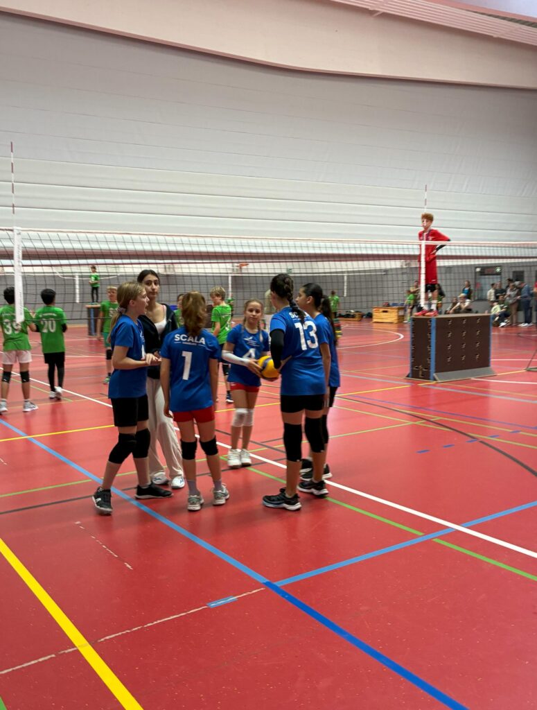 Nach der Besprechung der Trainer und der Begrüßung ging es pünktlich los. Es wurde gleichzeitig auf 4 Spielfeldern gespielt. Und um 09:30 war dann auch der erste Aufschlag für SCALA 1. Kurz danach ist auch SCALA 2 auf dem Spielfeld angetreten. Wir haben verschiedene Partien gespielt und dabei immer nach jedem Satz gewechselt. Die Spielerinnen und Spieler, die nicht gespielt haben, haben von der Seitenlinie aus ihre Teams unterstützt. „Haut drauf Mädels! Haut drauf!…“ oder „Habt ihr Mädels, habt ihr!“ Erstaunlich, wie laut wir und auch unsere Eltern anfeuern können.