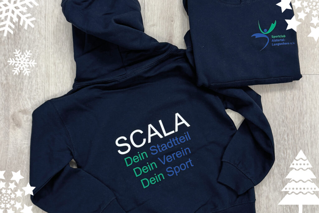 Außerdem machen wir, mit eurem Einverständnis, ein Foto deines Kindes im SCALA-Hoodie für unsere Bilder-Collage im neuen Jahr. Bringt gern eine Weihnachtsmannmütze mit!